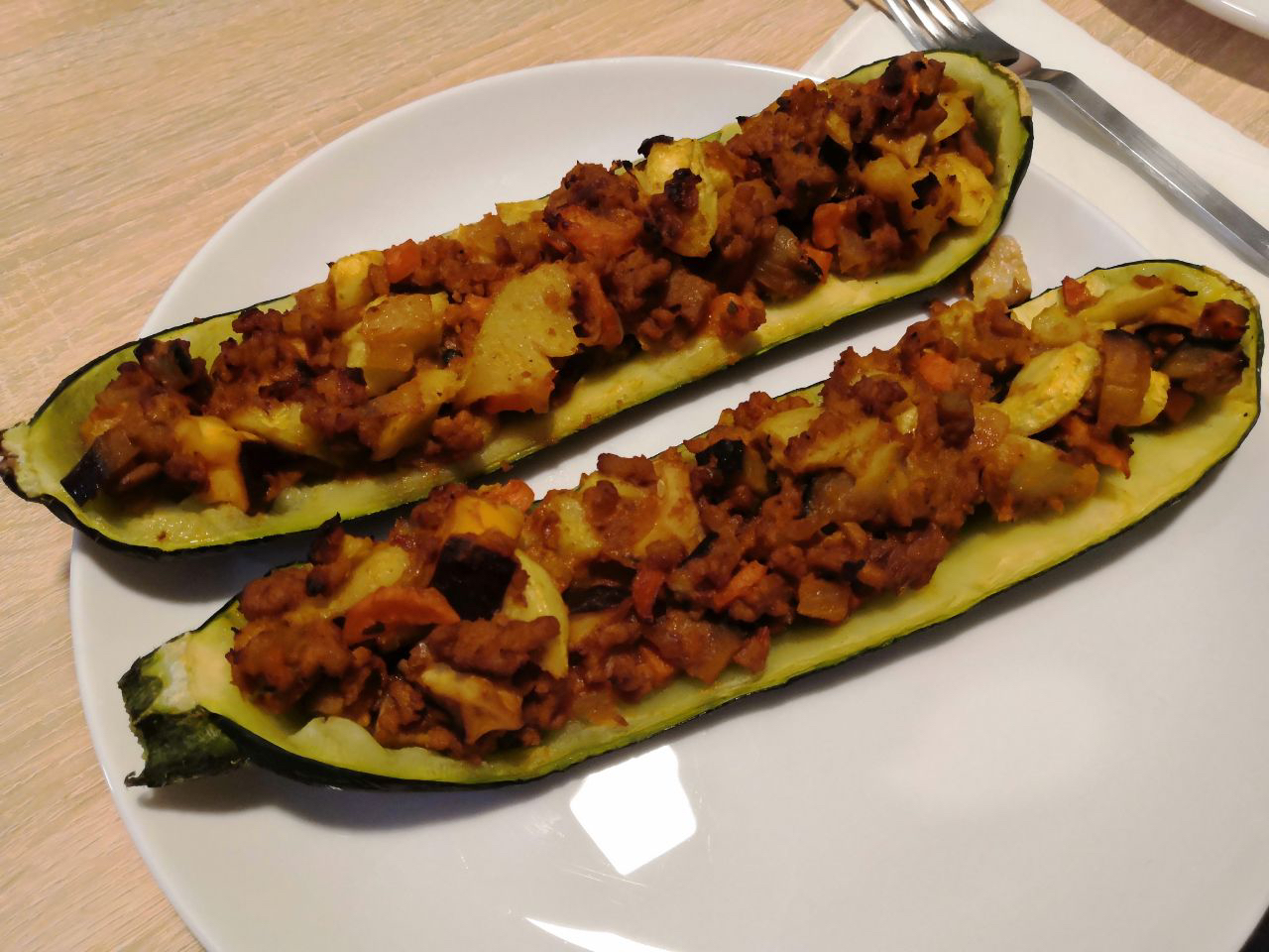 Lava los calabacines y sin pelarlos, córtalos por la mitad para hacer unas barquitas. Retira parte de las semillas y colócalas con la piel externa hacía abajo dentro del recipiente varoma -en esta posición no soltarán agua hacía el vaso-. Reserva
