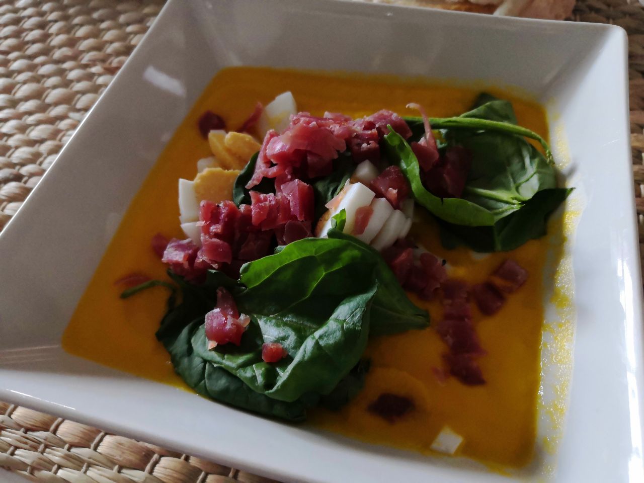 Servir con jamoncito picado y huevo duro. En la foto también lleva un poco de espinacas frescas.